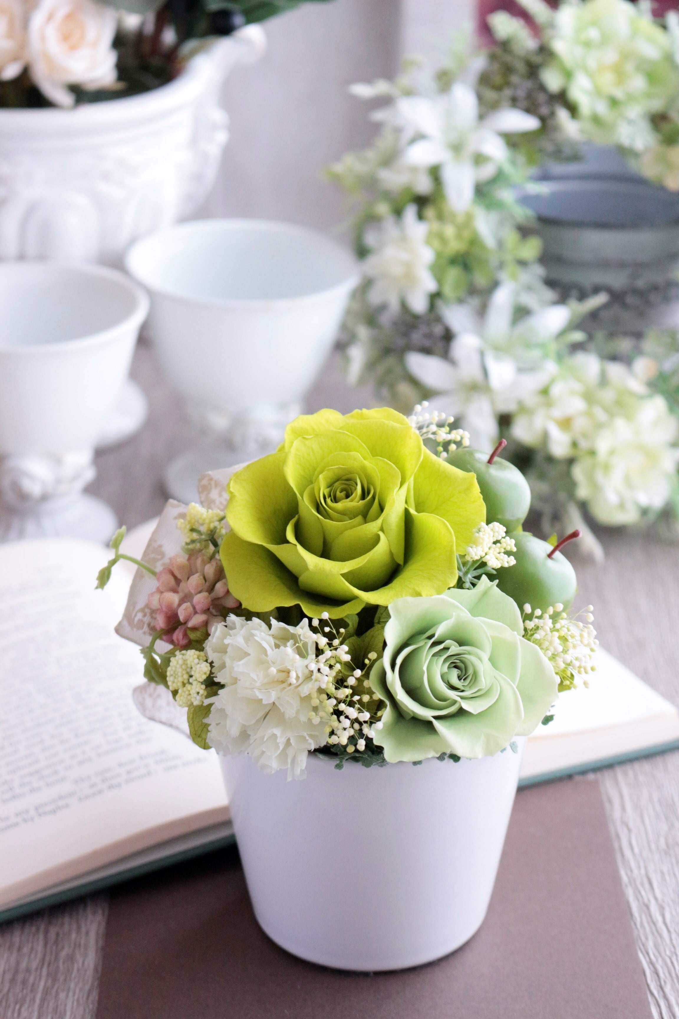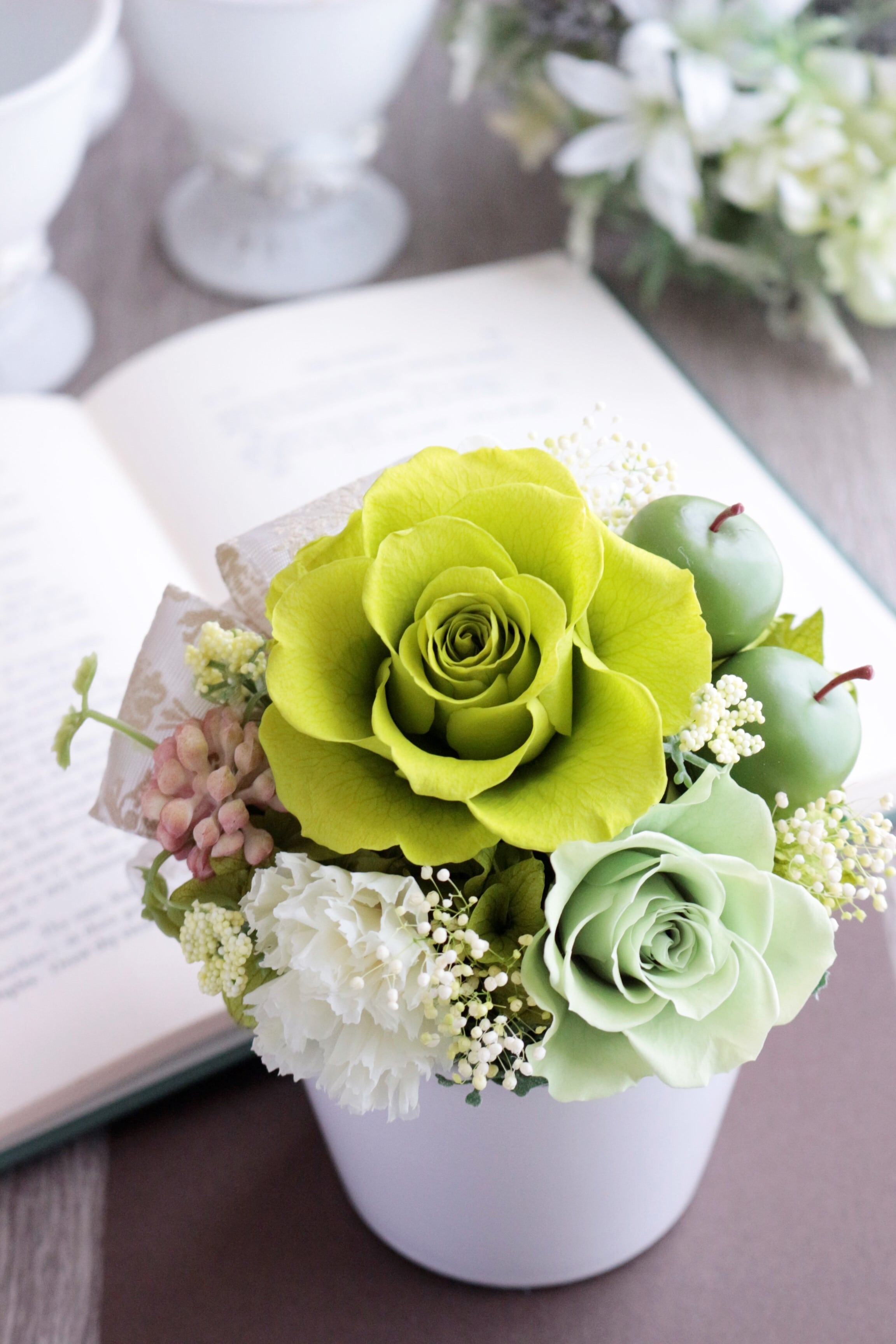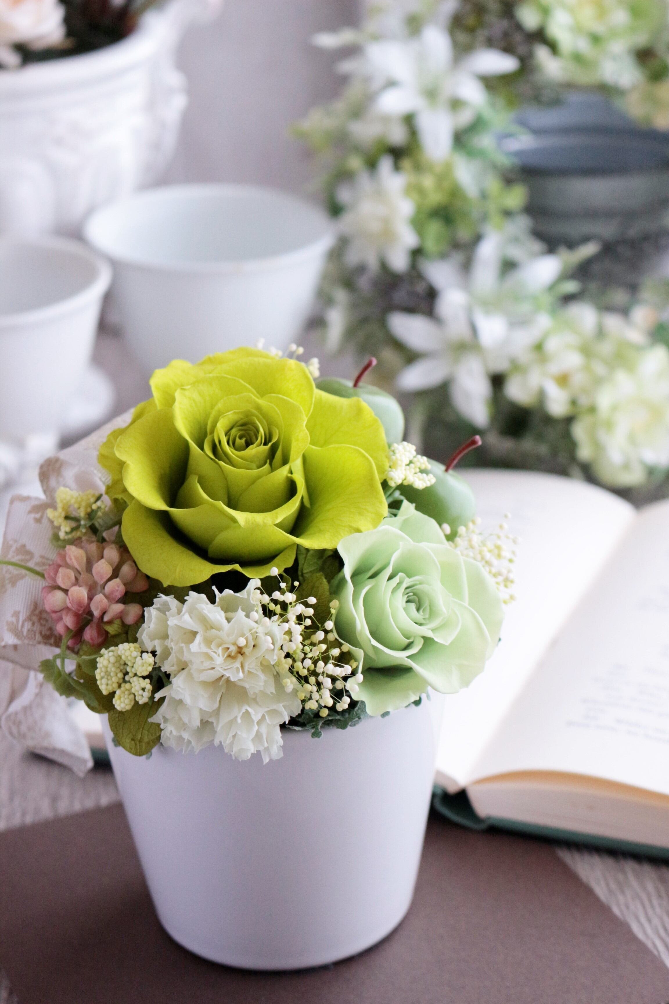 白い陶器の器に、バラ、カーネーション、リンゴや多肉植物(アート)などを合わせた可愛らしい雰囲気のアレンジです。
