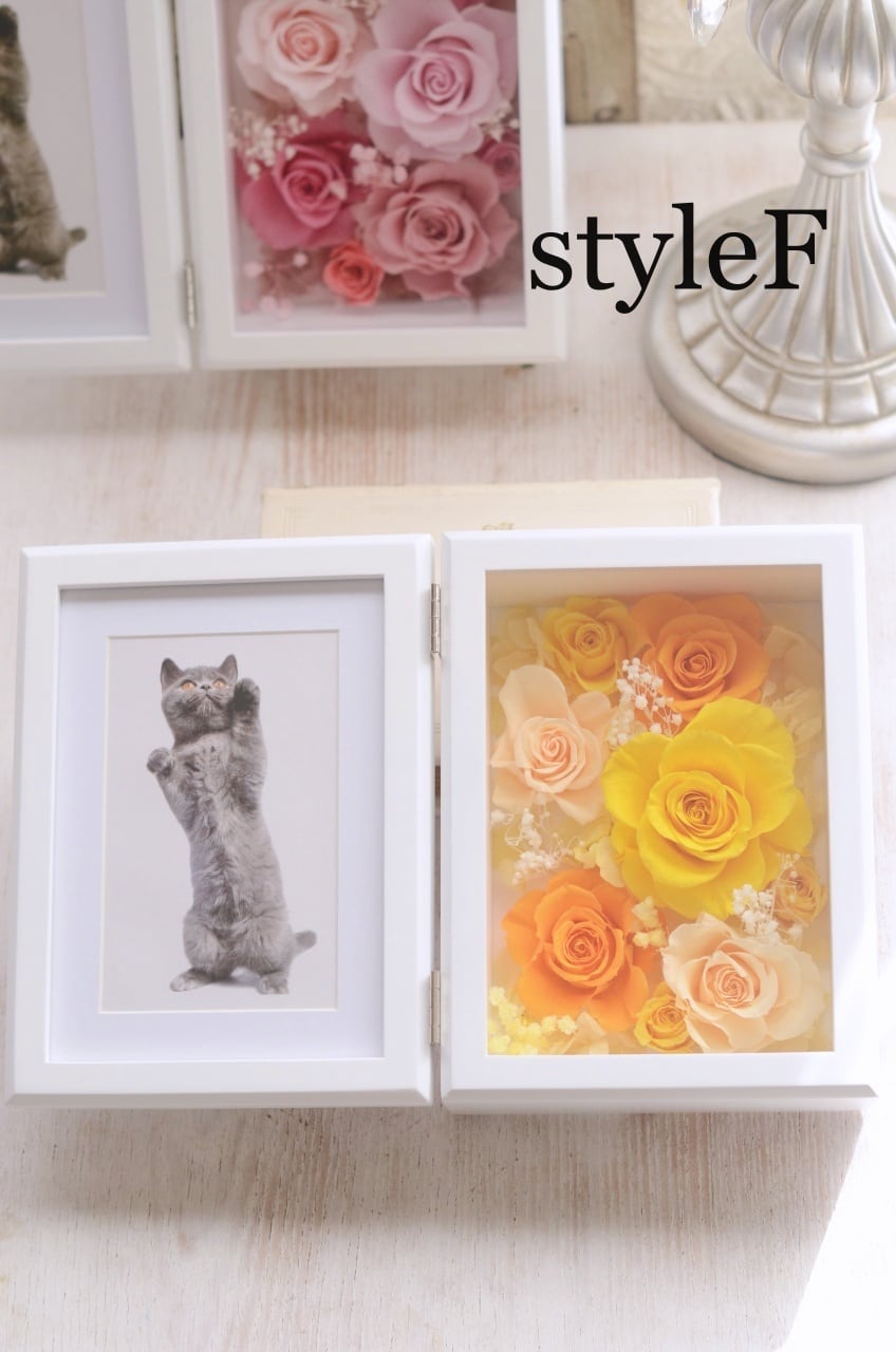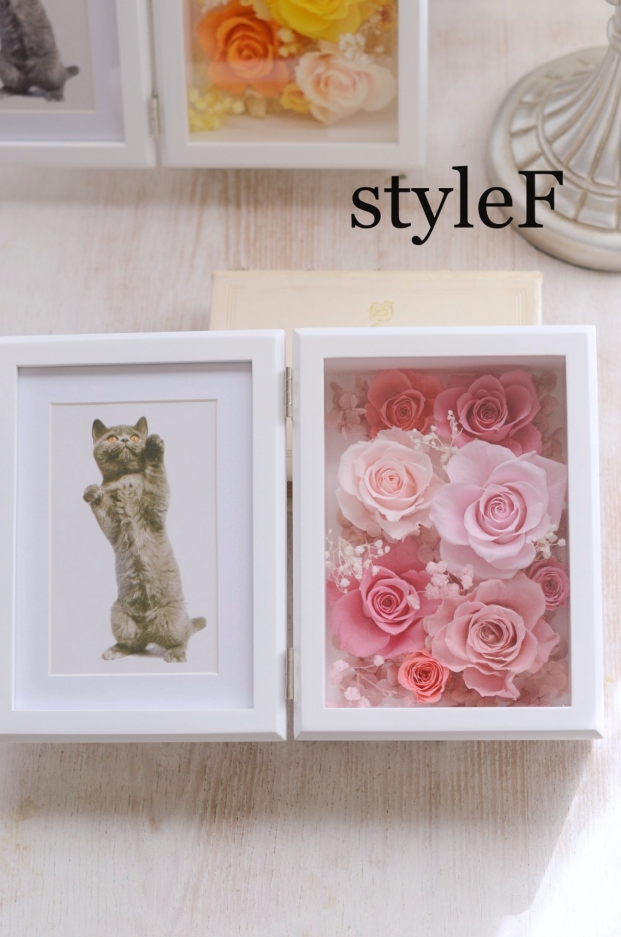 ブック型のフォトフレームには、片側にお花畑のように華やかにプリザーブドフラワーのローズ、紫陽花、かすみ草をアレンジしております。(全てプリザーブドフラワー)