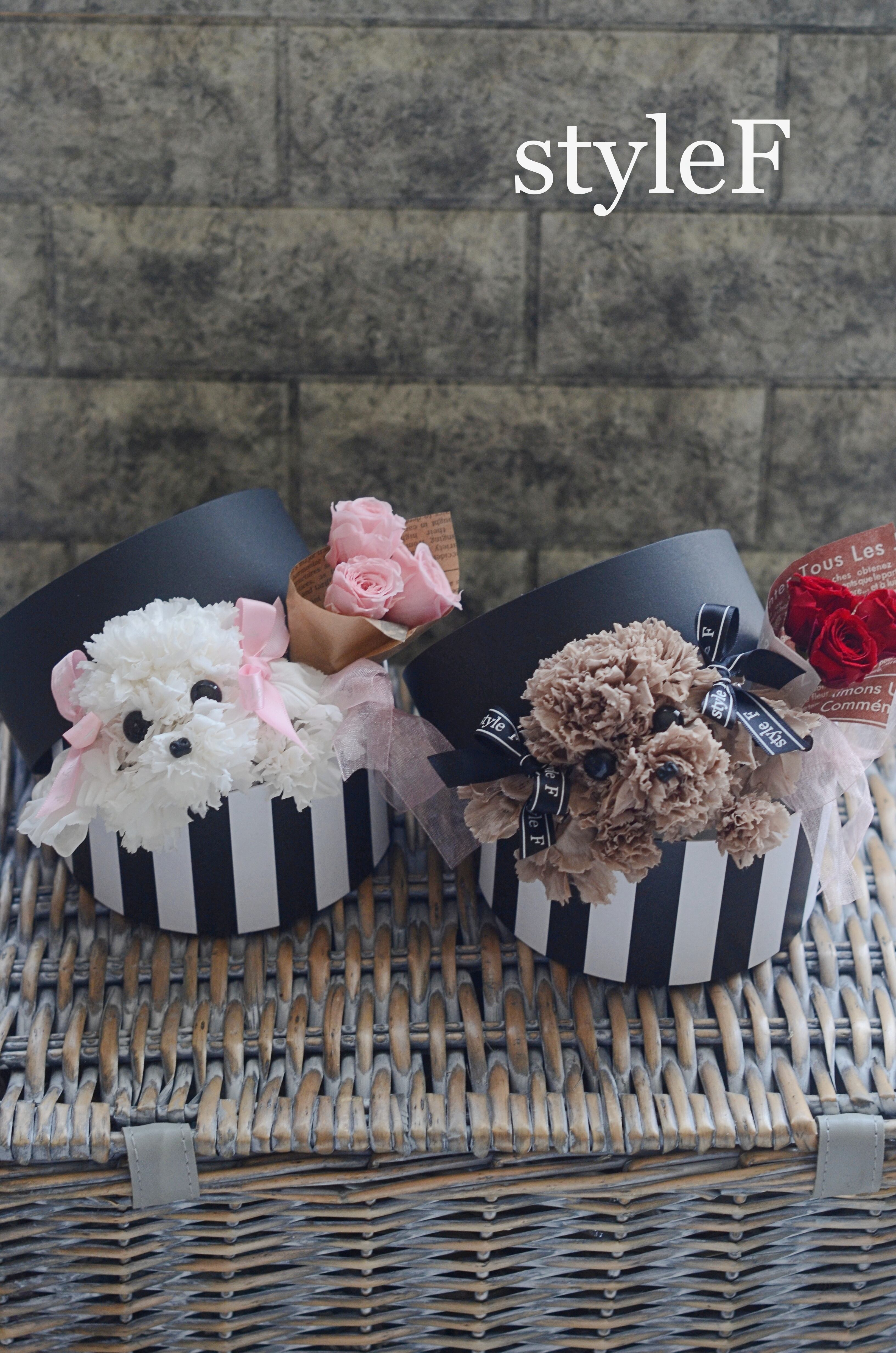 プードルと、ミニ花束をストライプ柄の円形BOXに。BOXから愛らしいプードルが顔を覗かせて、思わず、微笑んでしまうアレンジです。