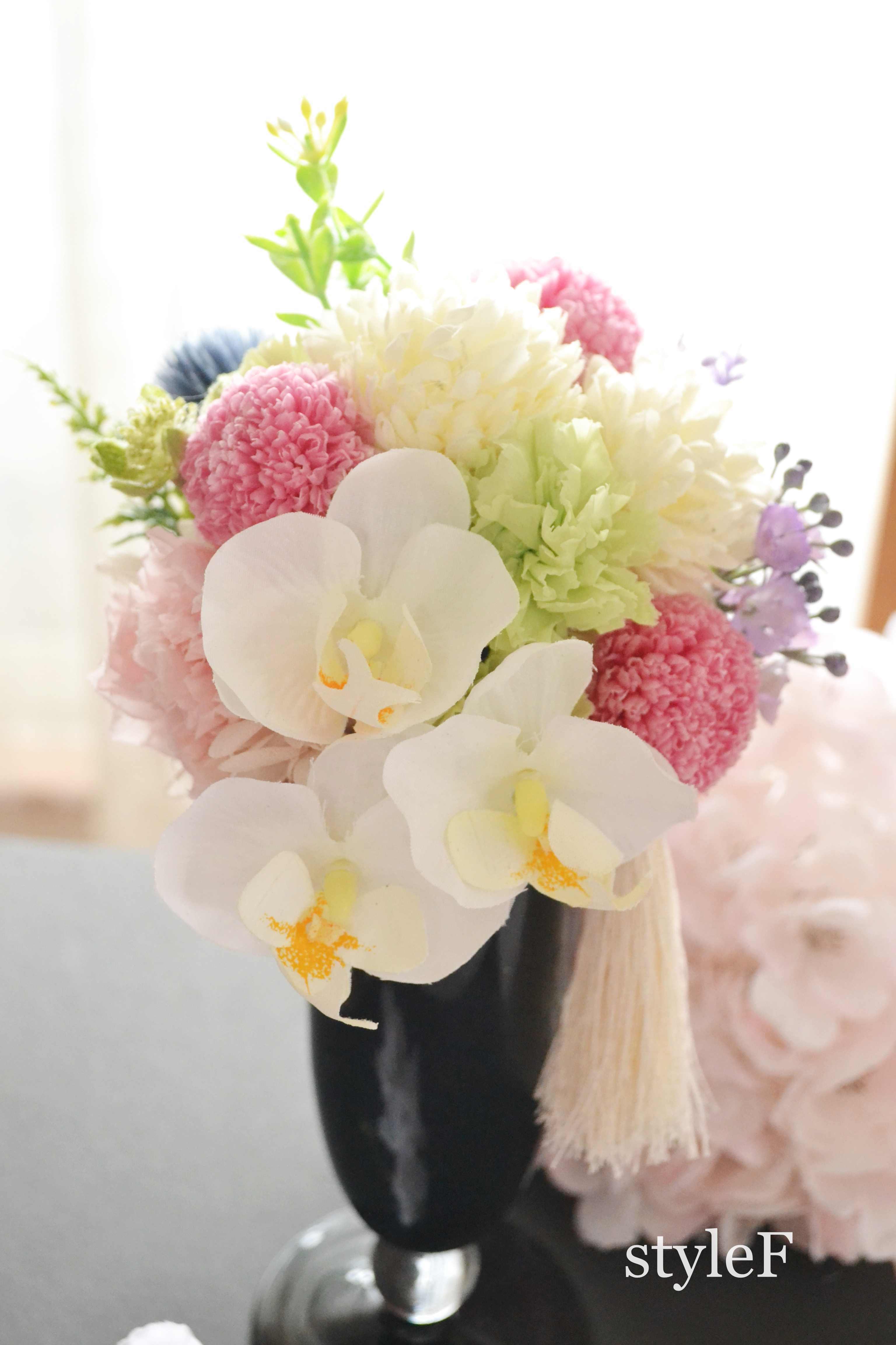アーティシャルの胡蝶蘭3輪にプリザーブドのローズ、カーネーションに大きめのフリンジをあしらったブラックグラスに入った落ち着いたアレンジです。