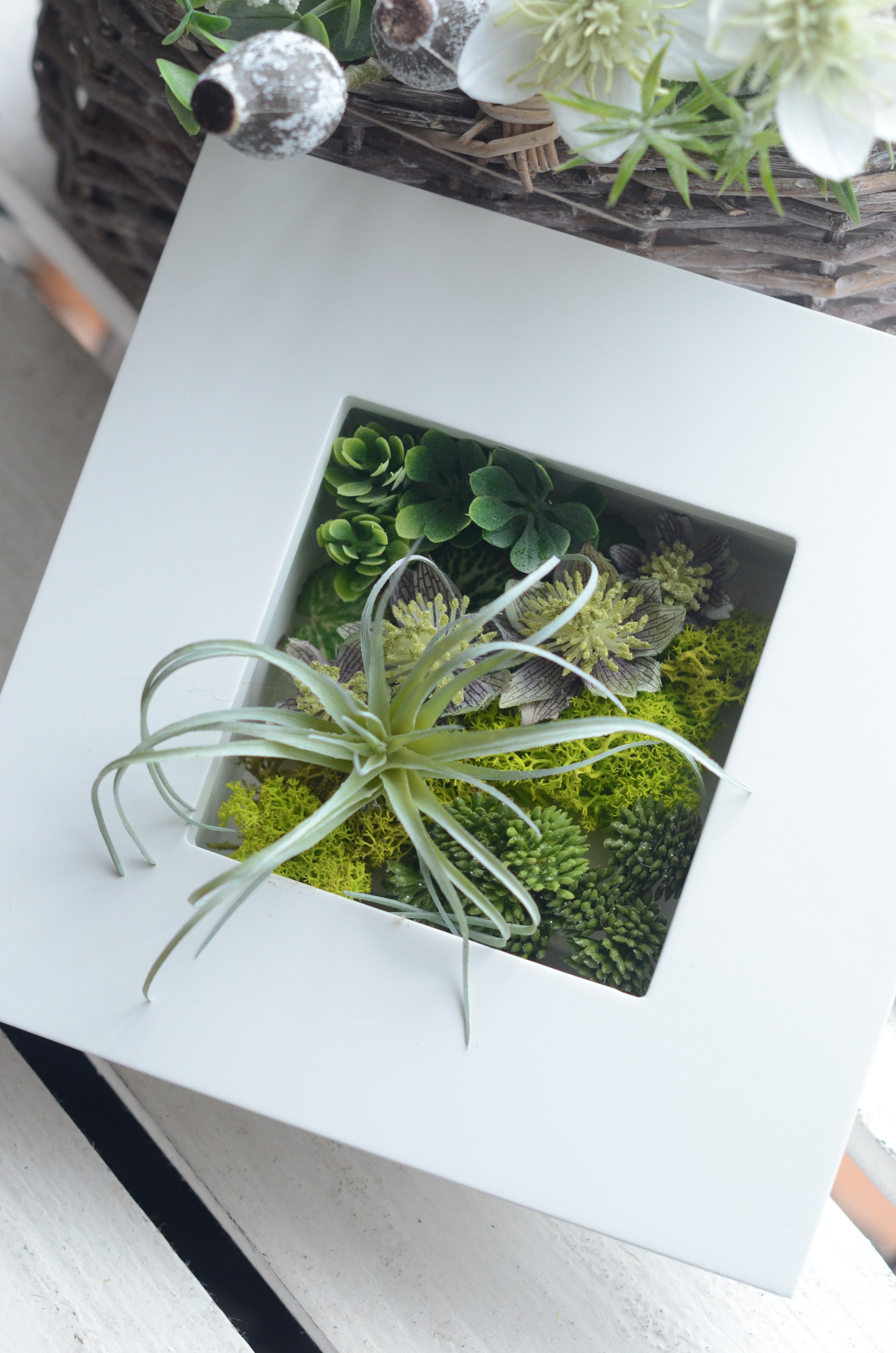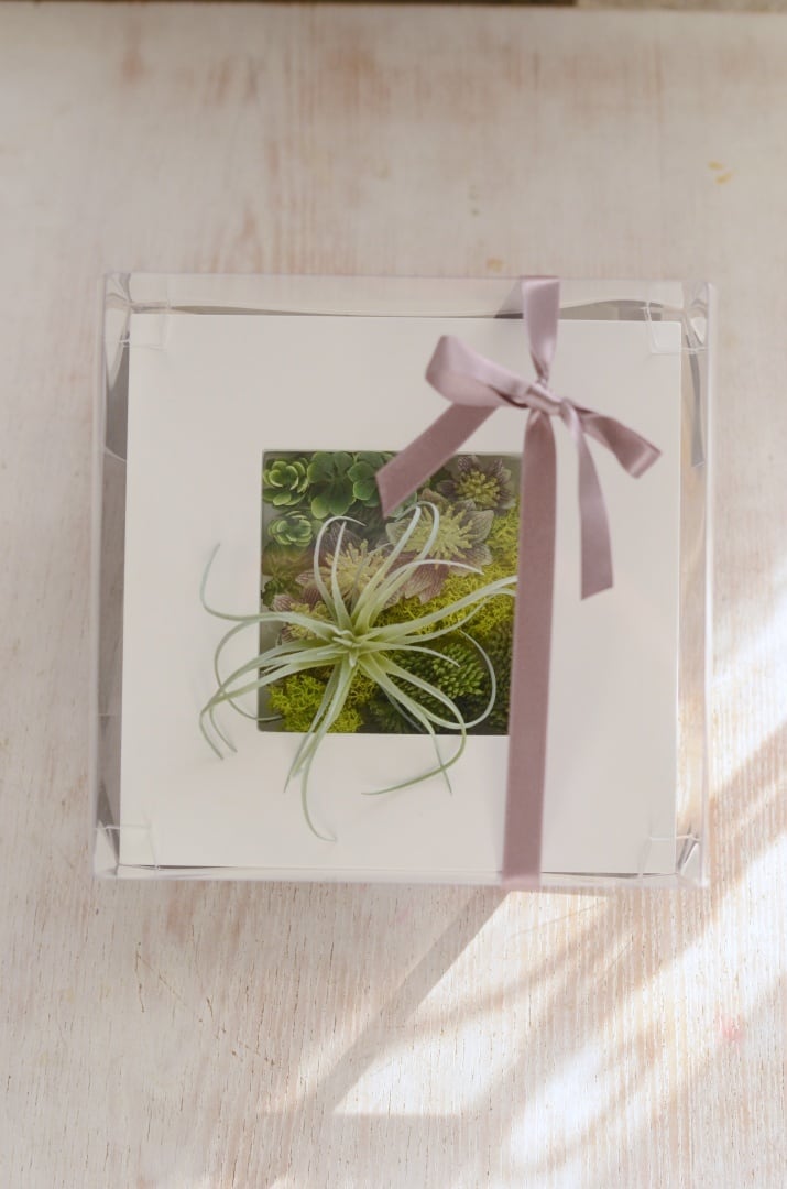 アーティフィシャルフラワーのシンプルなグリーンにエアープランツがポイントになったフレームアレンジは置いて飾る事も、壁にかけて飾ることもできます。同じタイプをいくつか並べてディスプレイしても素敵です。(こちらはアーティフィシャルフラワーのアレンジになります、プリザーブドフラワーではございません)