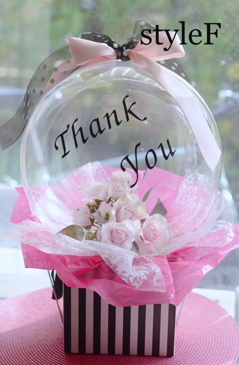 透明で綺麗なクリアバルーンの中にピンクの薔薇のブーケ(アーティフィシャルフラワー)が入れてた可愛らしいバルーンは、1つ1つ手作業で丁寧に作り上げております。