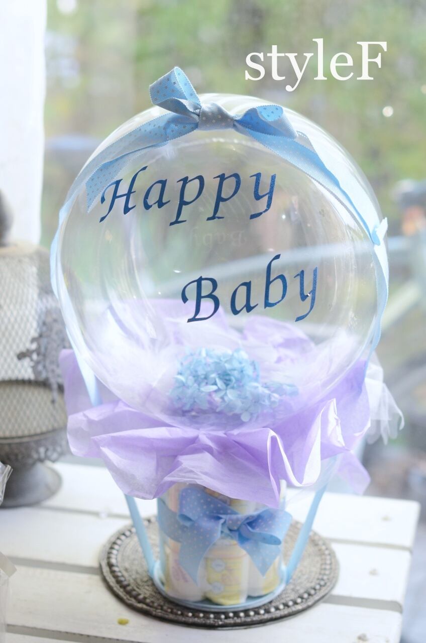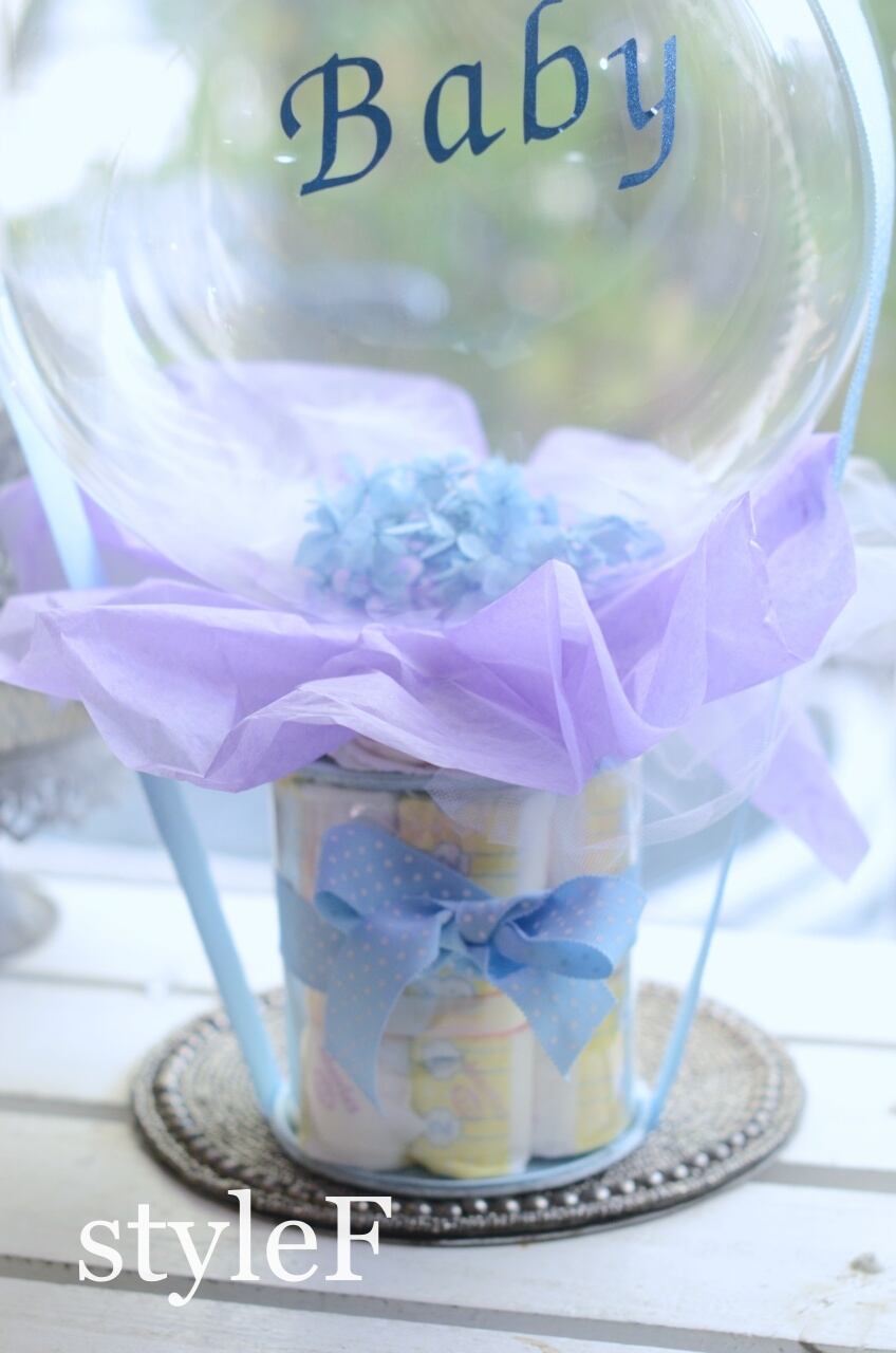 土台はダイパーケーキ(新生児用紙おむつ)で作られています。こちらはおむつとしてお使いいただけます。ダイパーケーキ土台はアーティフィシャルフラワーが華やかにデザインされております。その上に透明で綺麗なクリアバルーンの中にフェザーと紫陽花を入れた可愛らしいバルーンは、1つ1つ手作業で丁寧に作り上げております。