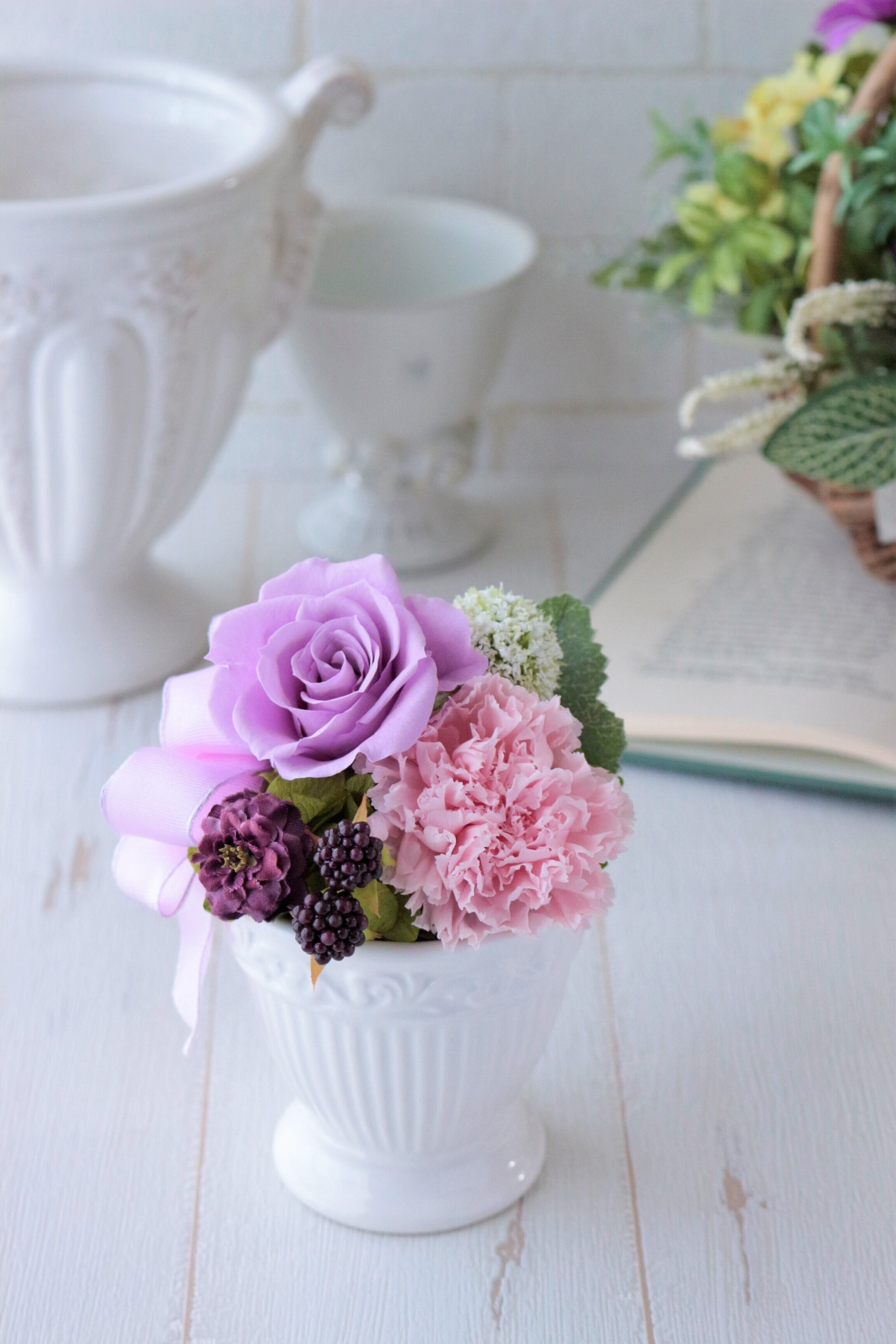 白い陶器の器に、バラ、大輪のカーネーション、アーティフィシャルフラワーやフェイクの実物などを合わせた可愛らしい雰囲気のアレンジです。
