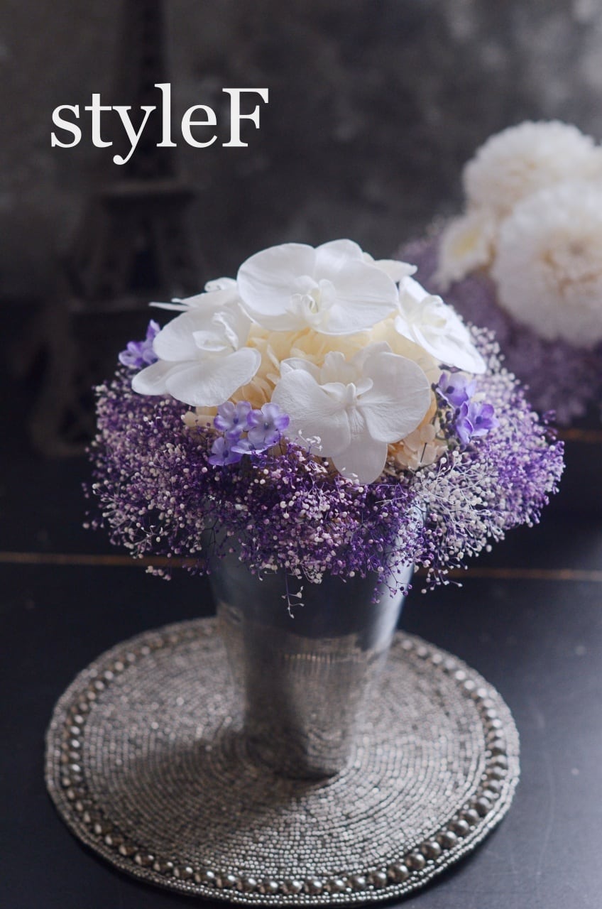 小花のみ一部アーティフィシャルフラワー使用。その他はプリザーブド。