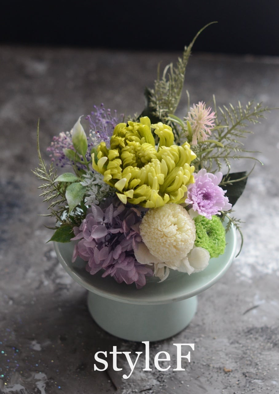 プリザーブドフラワーの大輪の菊をメインにマム、小菊、紫陽花のプリザーブド、アーティフィシャルフラワーが入ったお悔やみのお花。様々な色の入った複色のアレンジです。
