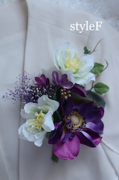 白のクリスマスローズ、紫のアネモネを組み合わせたとても華やかな雰囲気。かすみ草はプリザーブドフラワーを使用しております。