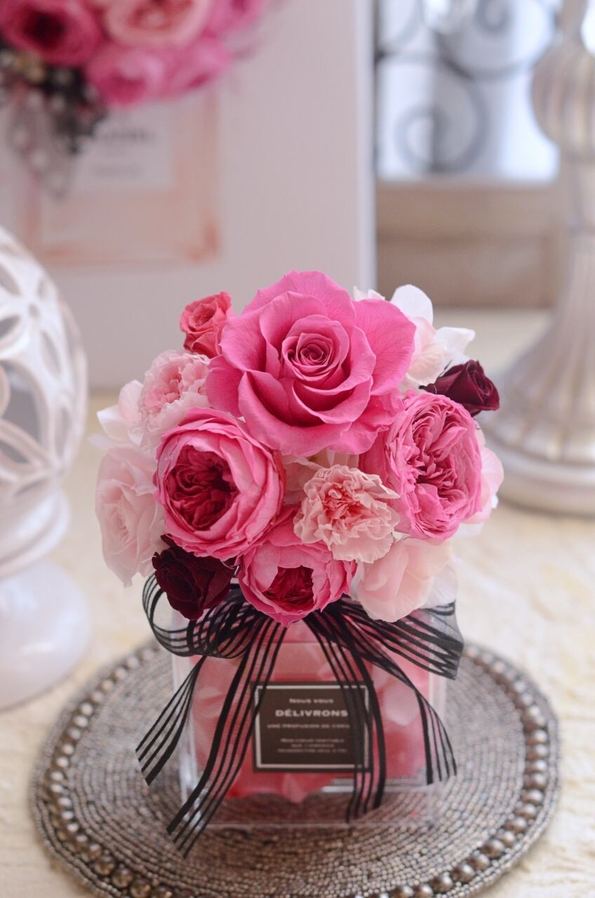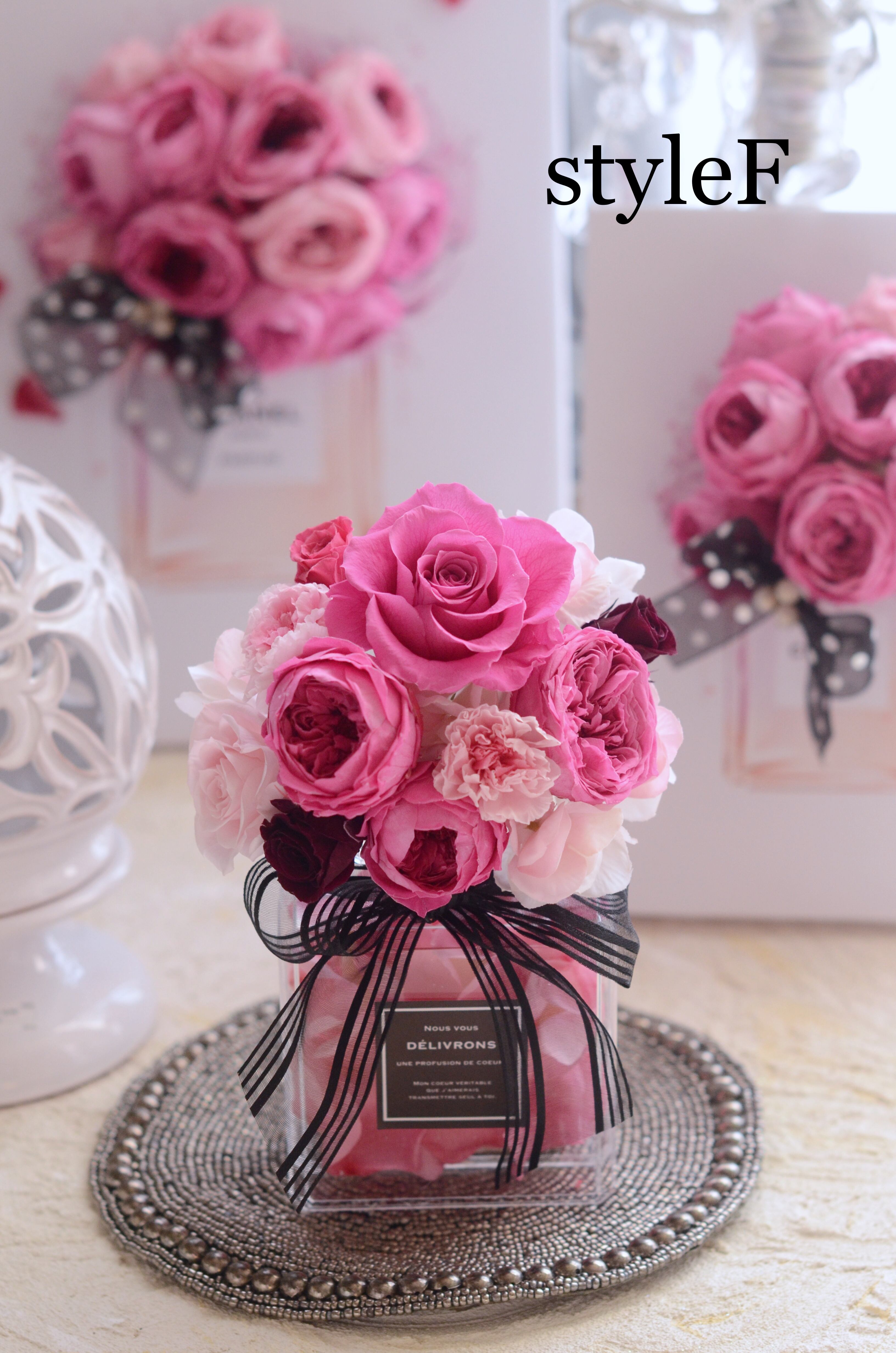 透明なアクリルのパフユームボトルの中にもプリザーブドのバラ大小の花びらをデコレーションし、上部には、プリザーブドフラワーのピンク系のばら2種類、カーネーションで華やかにアレンジ(一部、アーティフィシャルの紫陽花を使用しております)。パフュームボトルにはシアーなブラックのおリボンを結び、女子心くすぐる可愛いらしいアレンジは、インテリアに目をひくデザインと華やかさがあります。